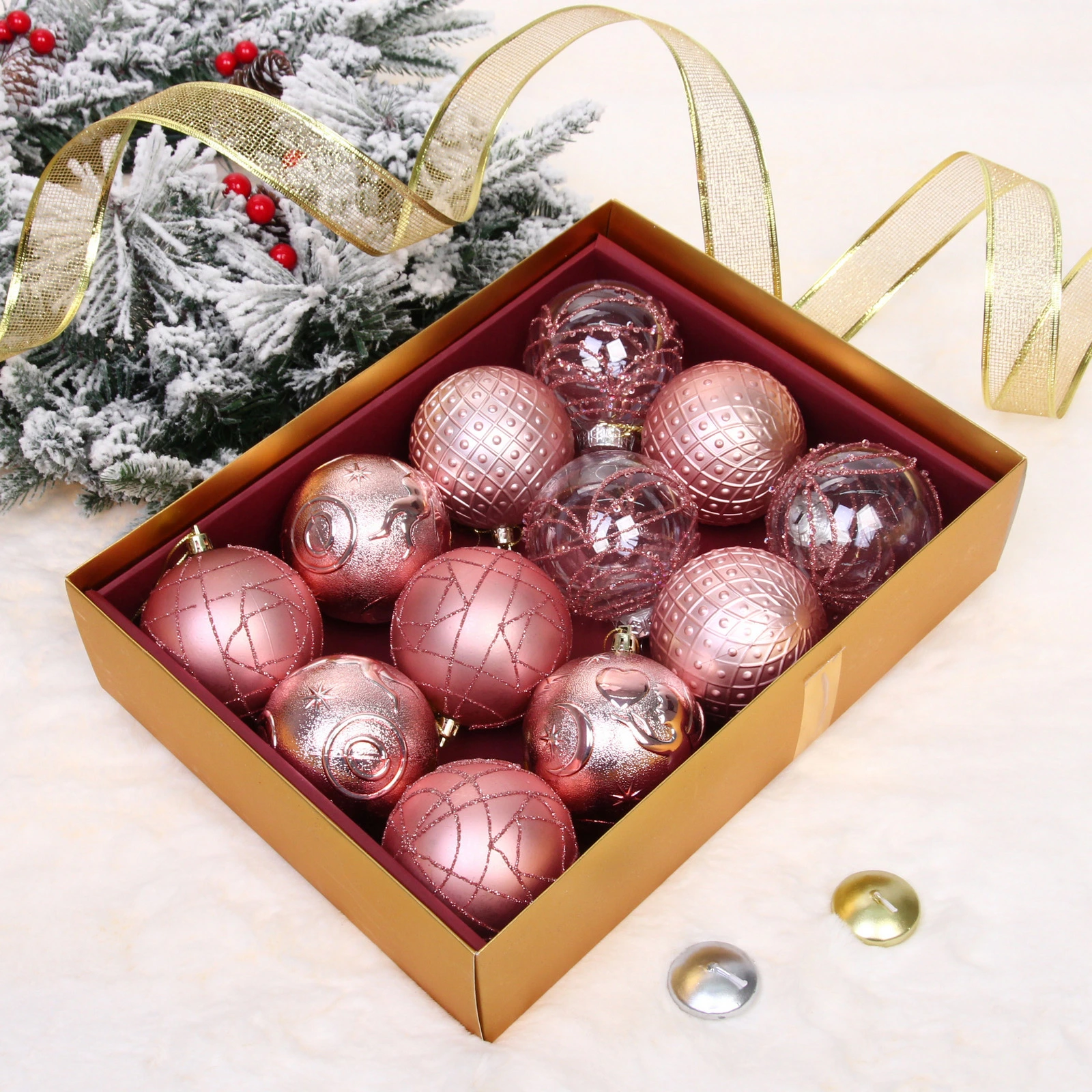 Новогодние шары "Зимняя нежность" 8 см (набор 12 шт), Розовое золото