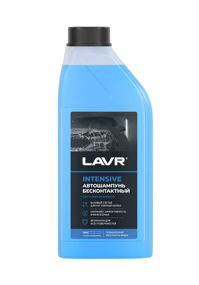 Автошампунь для бесконтактной мойки Intensive LAVR – концентрированное средство для очистки внешних поверхностей автомобилей, мотоциклов, велосипедов и т.д. Состав с высоким пенообразованием размягчает и отслаивает частицы грязи, которые затем легко смываются водой. Безопасен для лакокрасочного и других покрытий.